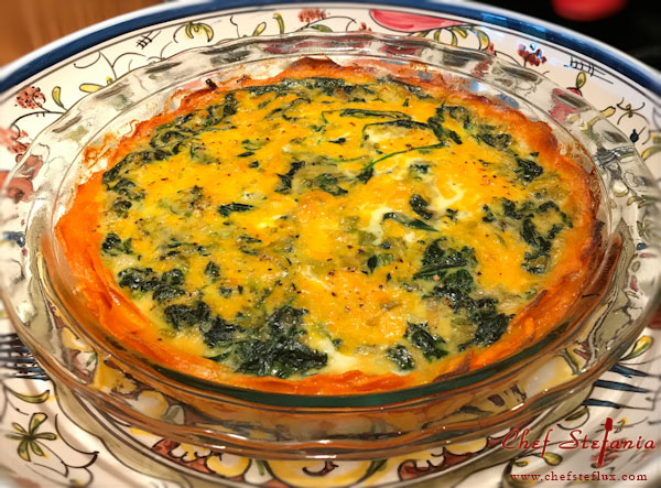 This spinach tart with sweet potato crust is a healthy version of a traditional favorite. Simply substitute veggie cheese for regular cheese, and olive oil for butter and you’ll have what I call a “trim tart.”