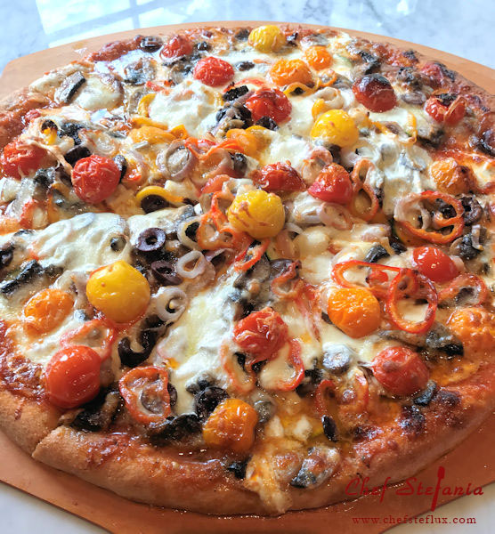 A tasty vegetarian pizza made with whole wheat crust is fantastic as a snack or complete meal. This pie’s topping are red / yellow cherry tomatoes, red / yellow peppers, mushrooms, non-fat mozzarella cheese, oregano and kalamata olives. However, you can be creative and add the veggies you love. Some favorites are: onions, artichoke hearts, bell peppers (green / orange), garlic, broccoli, basil, green olives, eggplant, jalapeño, pesto and pumpkin.